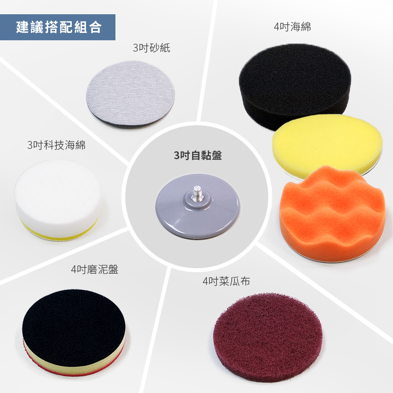 通用配材:延長桿、4吋打蠟海綿(波浪、平面)、4吋薄海綿、4吋菜瓜布、3吋科技海綿、3吋砂紙、4吋磨泥盤。