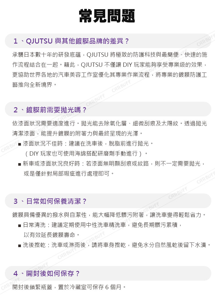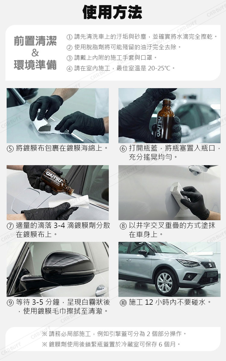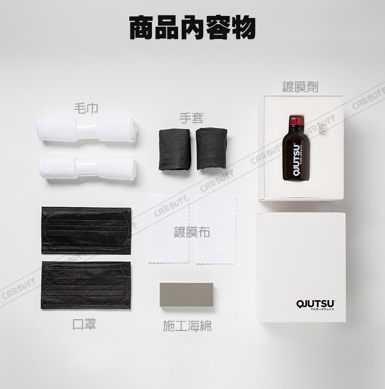 內容物:鍍膜劑x1罐、施工海綿x1入、鍍膜布x2入、毛巾x2入、手套x2入、口罩x2入