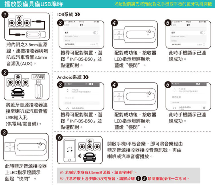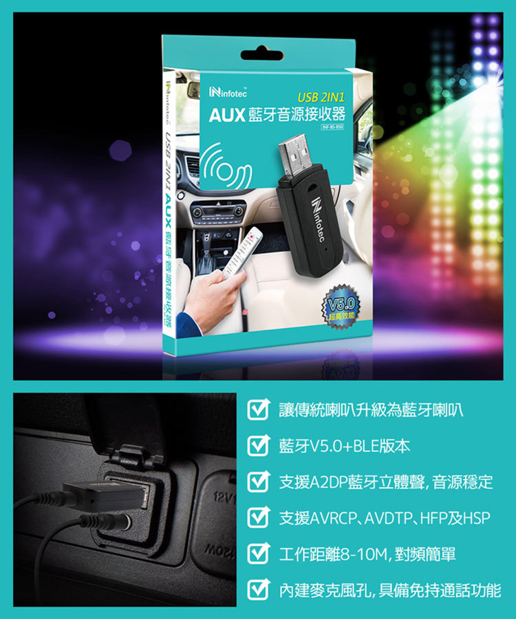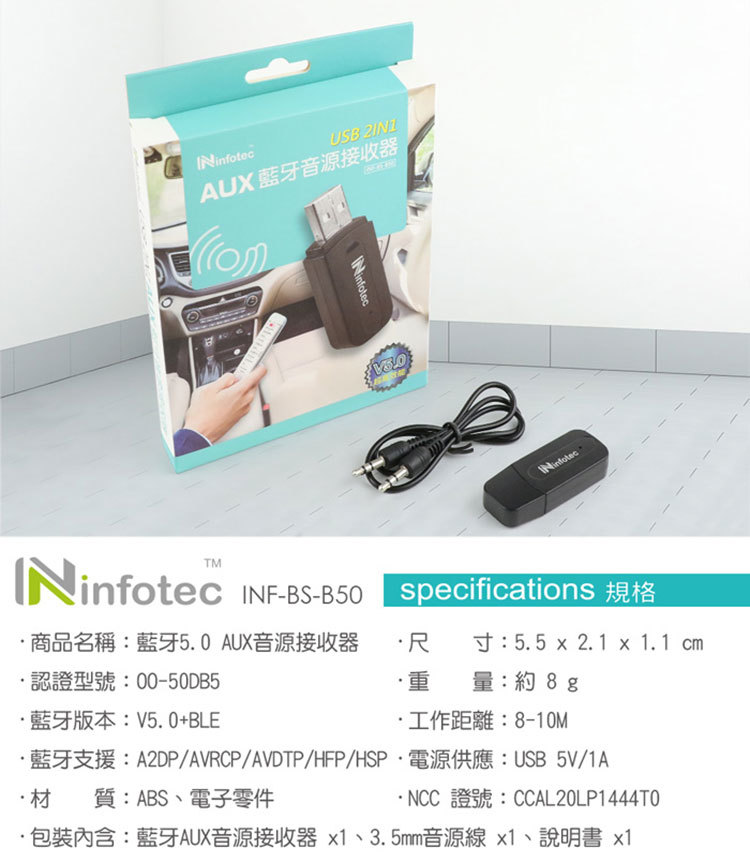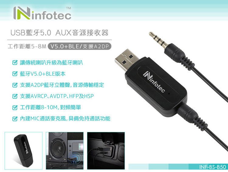 商品名稱:infotec USB藍牙5.0 AUX音源接收器