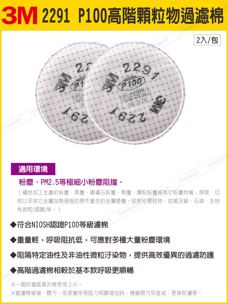 【3M 2291高階顆粒物過濾棉 x2片/包 ( 2包/共4片)】材質:聚丙烯,產地:美國