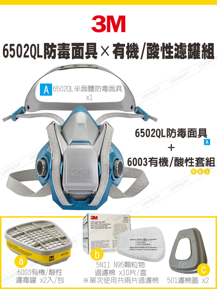 品名:3M 6502QL防毒面具+6003有機/酸性濾罐組
