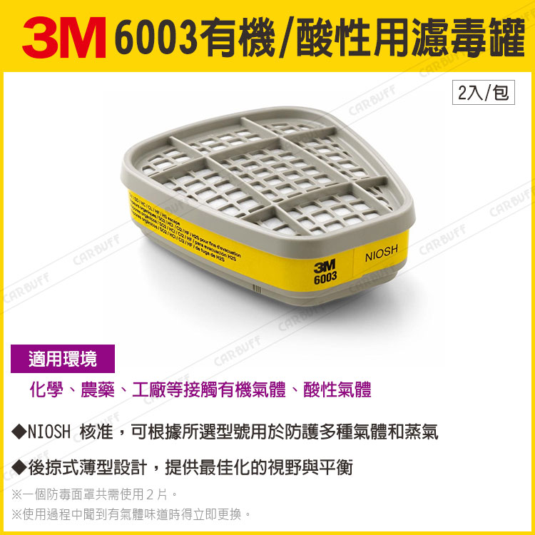 【3M 6003有機/酸性用濾毒罐 x2入/包】主要成份或材料:活性碳,淨重:約187克/包,產地:韓國