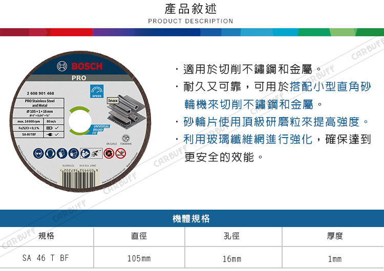 品名:BOSCH博世 PRO Stainless Steel and Metal 4英吋切削砂輪片